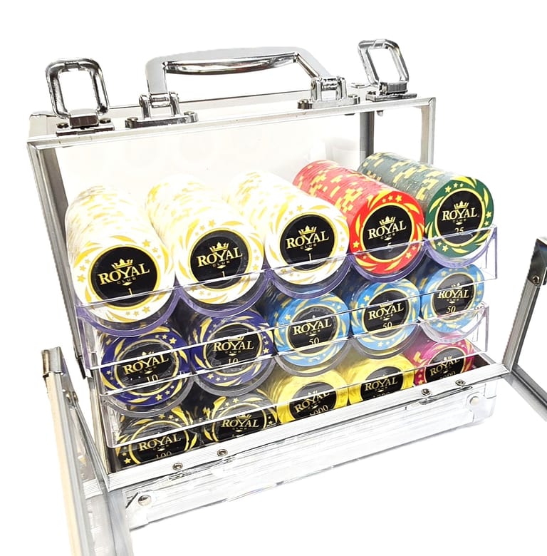 The Royal 14g Clay Composite Chips deliver durability, vivid style, and a true casino vibe—making every hand feel regal.